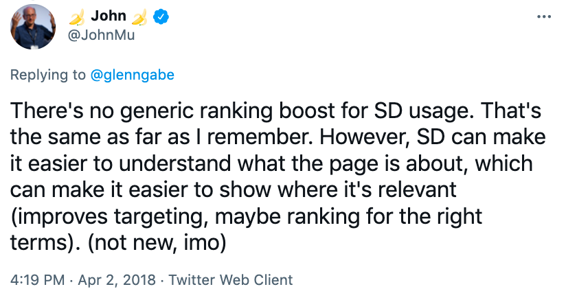 Вкратце: Мы используем разметку чтобы лучше понять контент и где оно более релевантно. Но только из-за этого страница лучше не становится.